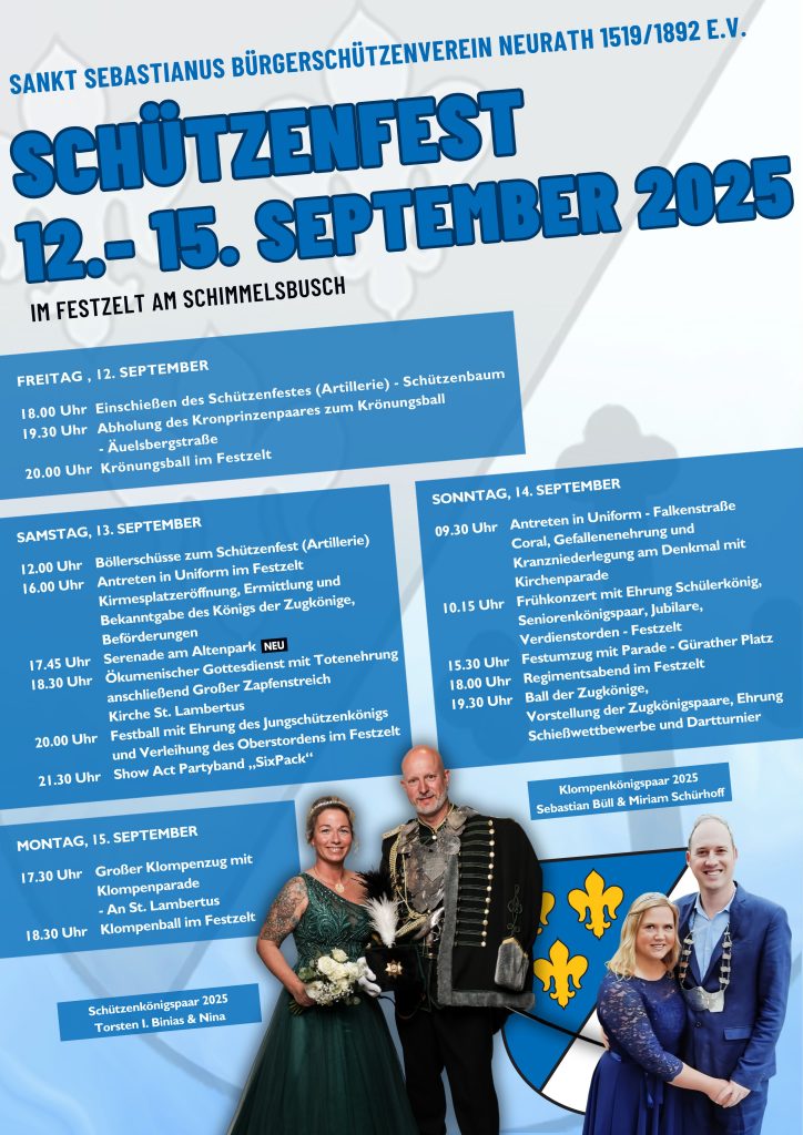 Auch in diesem Jahr findet wieder das Neurather Schützenfest statt. Wir freuen uns darauf euch vom 12. – 15. September im Festzelt und auf den Straßen in Neurath begrüßen zu dürfen.